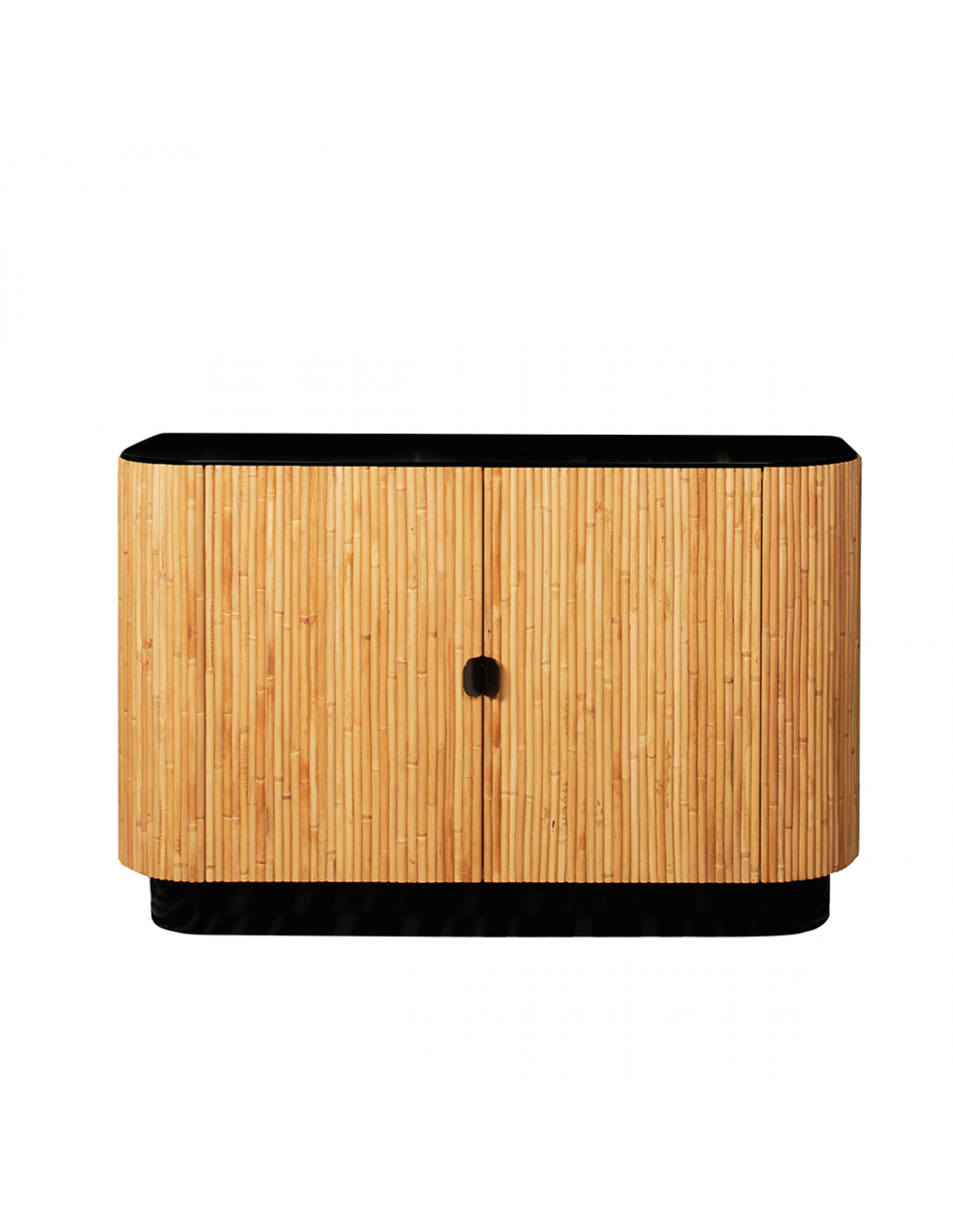 Le buffet Riviera combine un plateau en bois de couleur et une structure en rotin aux tonalités chaudes et changeantes selon les lamelles, chacune soigneusement cloutée à la main.