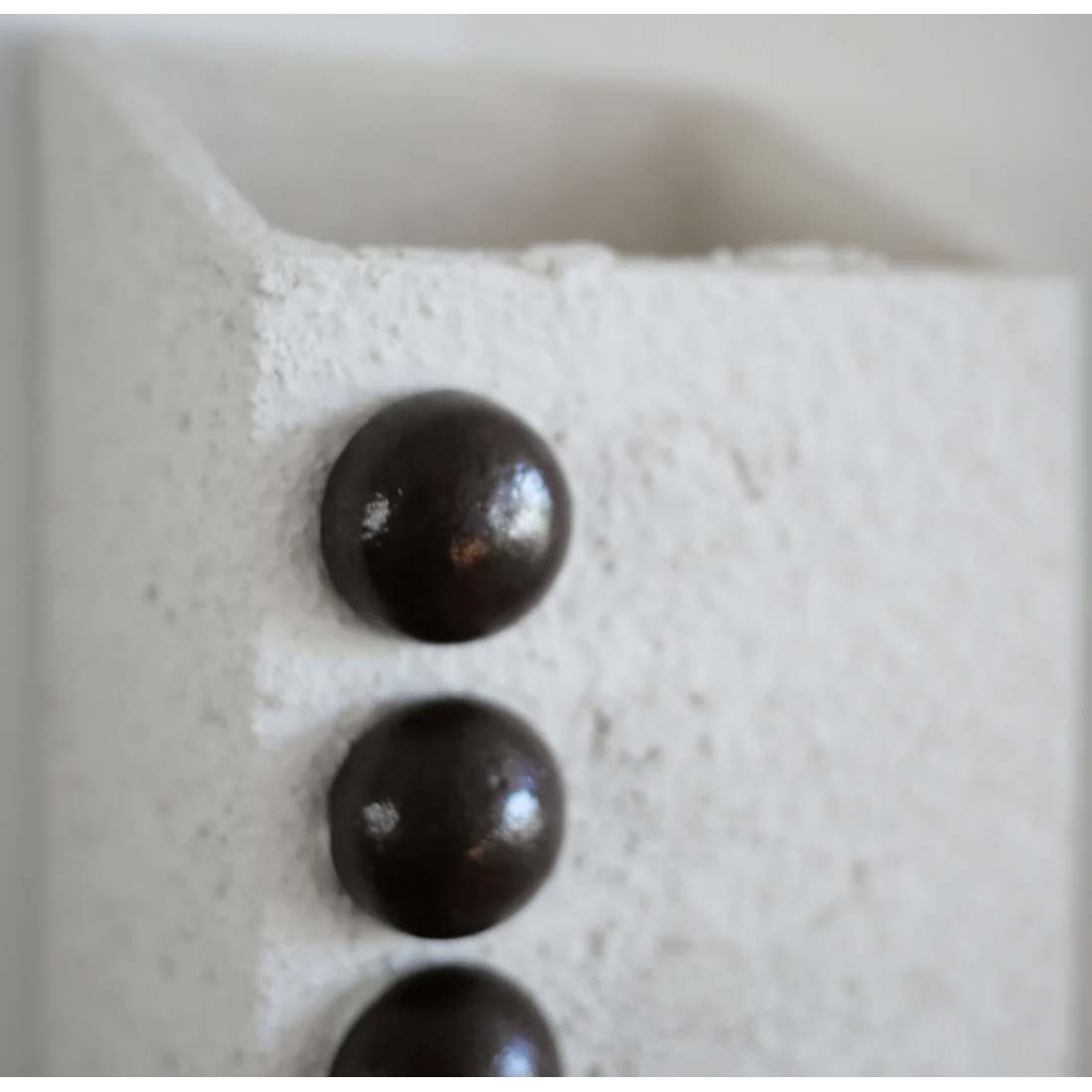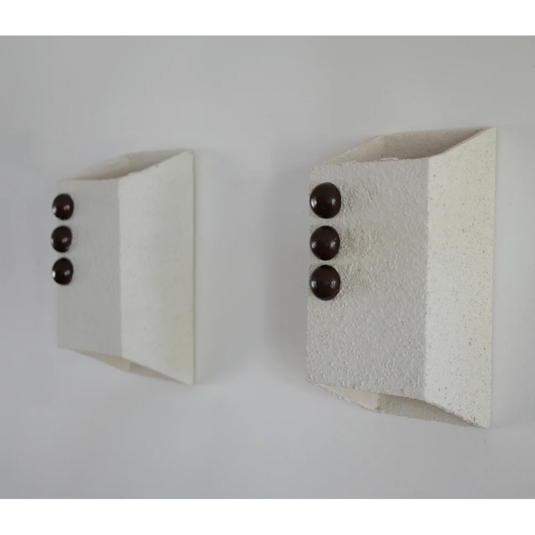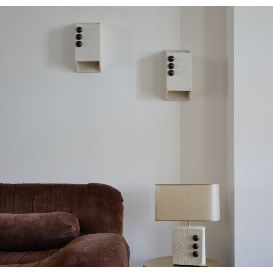 L’applique Magma joue la carte de la discrétion expressive. Sa forme compacte en crépi écru, soulignée par trois boutons en céramique marron, apporte relief et caractère au mur.