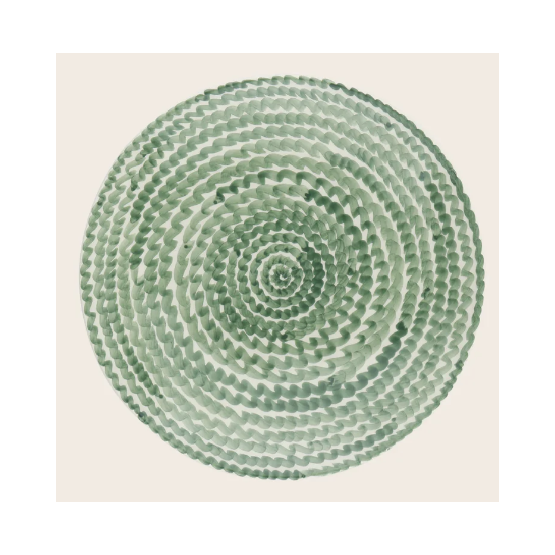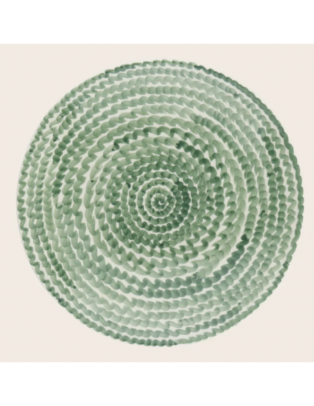 Vert frais et végétal, noir profond et intemporel ou bleu poétique s'y épanouissent en petites spirales, comme des vagues au creux de l'assiette... Chaque pièce est unique car le talent du potier permet à chaque assiette de prendre vie.