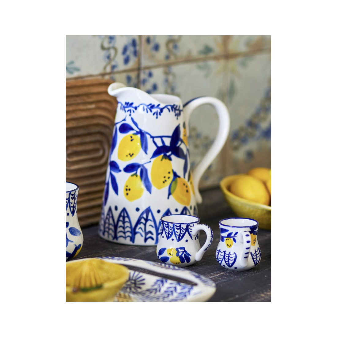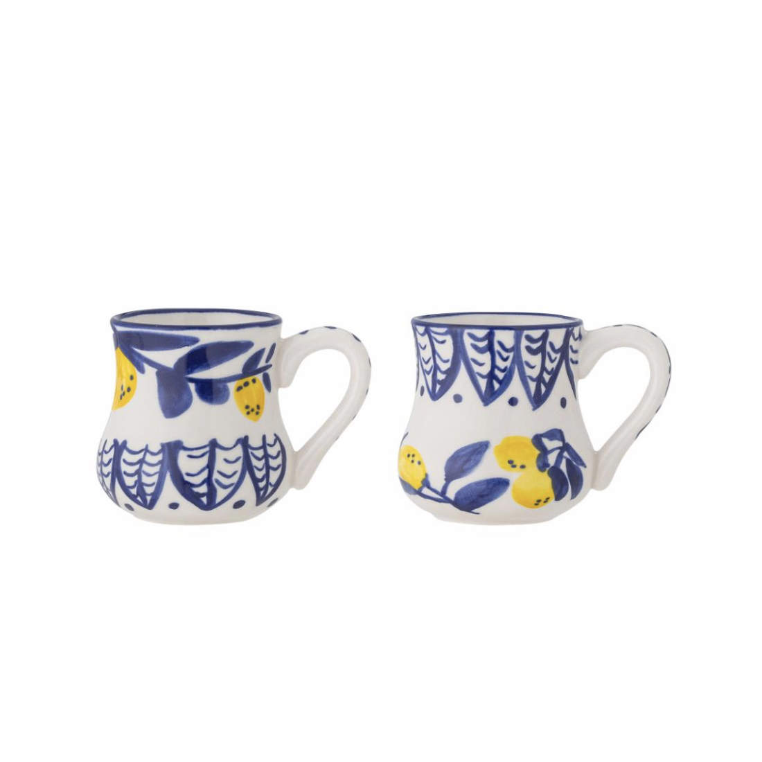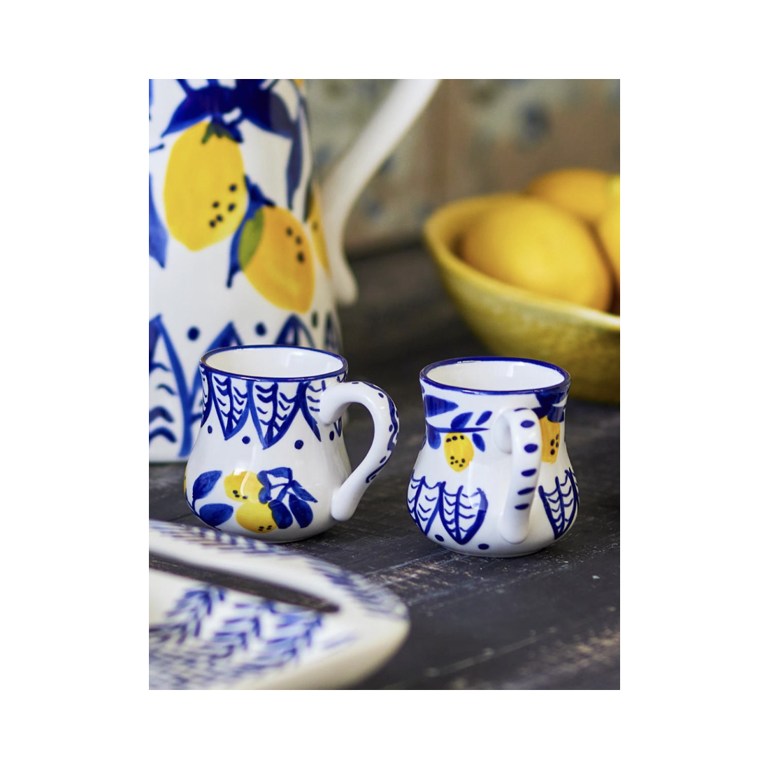 Les tasses sont décorées à la main avec des motifs colorés dans des tons de bleu et de jaune frais, inspirés par la beauté de la Méditerranée.