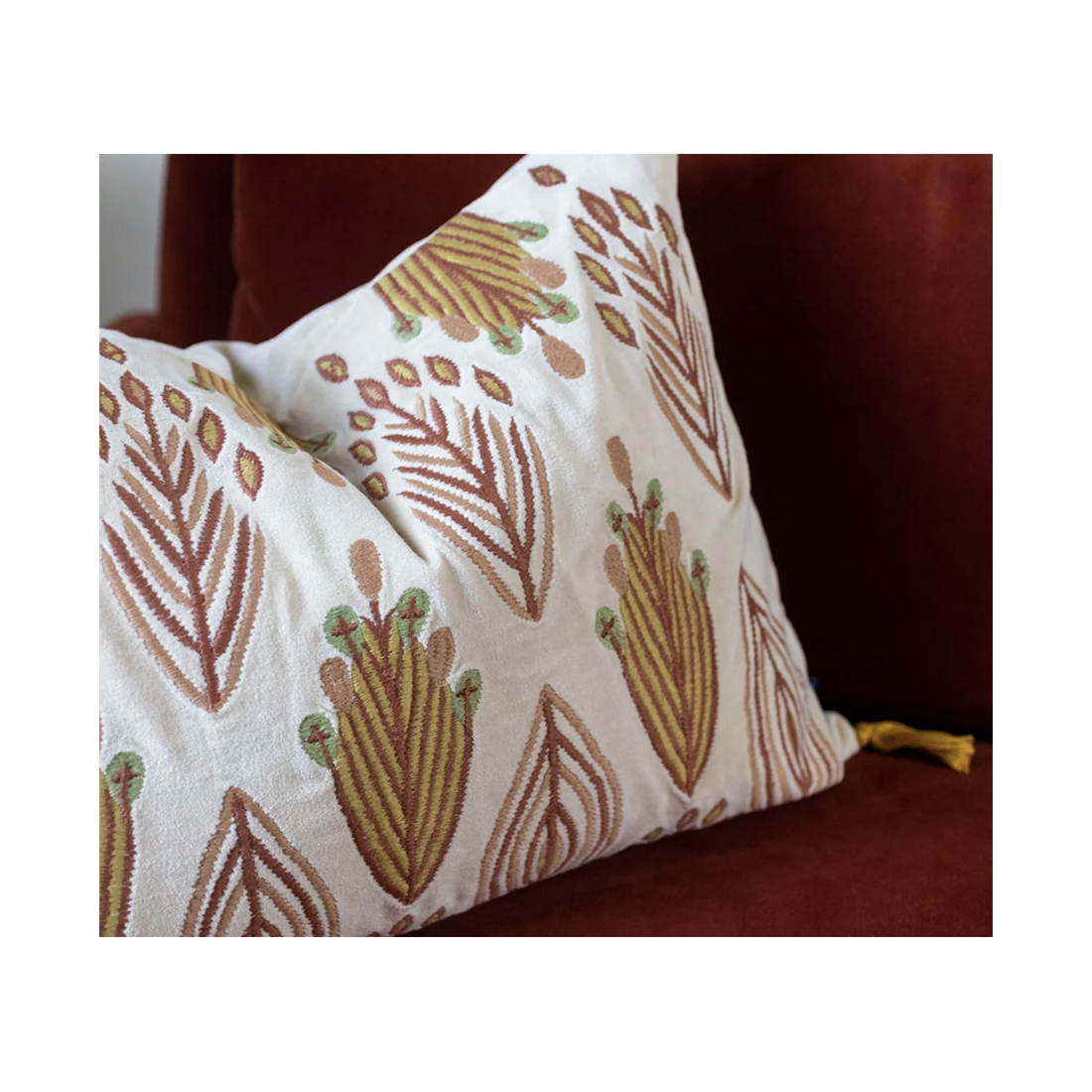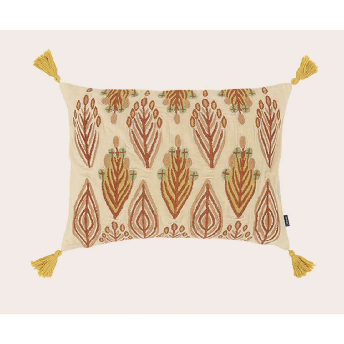 Ces détails dans les motifs, c’est la marque d’une broderie experte qui permet de donner au dessin ce volume presque gravé, et ces subtils entrelacs colorés. Aux quatre coins de la housse, des petits pompons donnent à Patta une touche de fantaisie supplémentaire.
