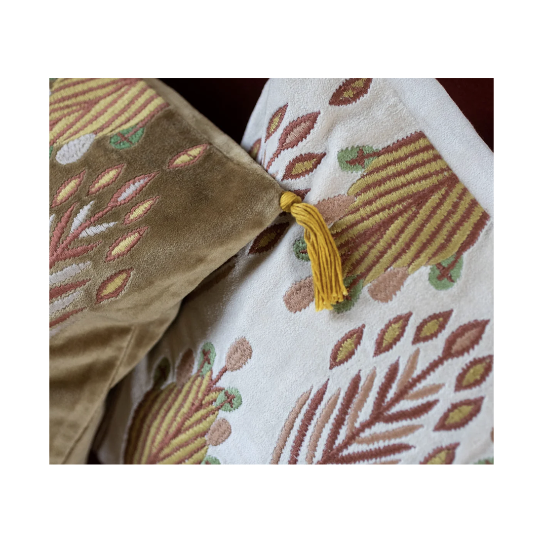 Sur leur fond coloré, un motif géométrique se dessine en broderies : des plumes qui semblent prêtes à prendre leur envol.