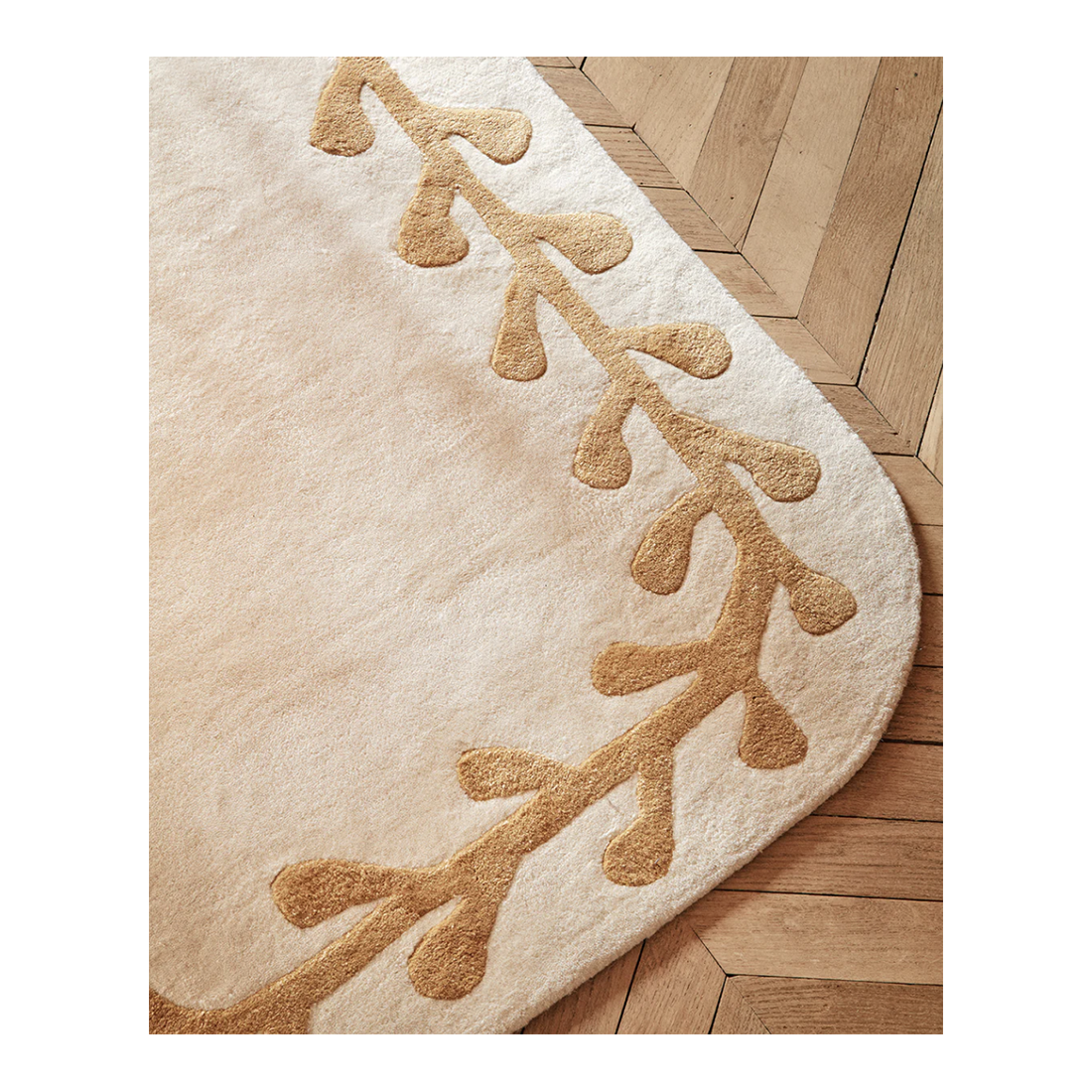 Réalisé en tuft main, ce motif délicat révèle toute la dextérité du geste artisanal, capable d’évoquer la nature avec élégance.