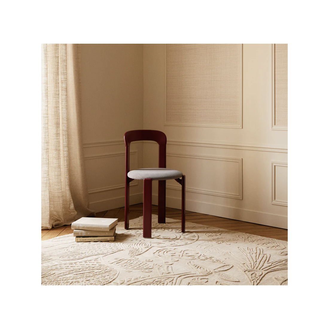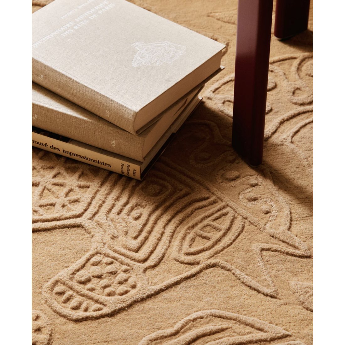 Sculpté à la main dans une laine écrue, le tapis dessine un motif en haut-relief qui capte la lumière.