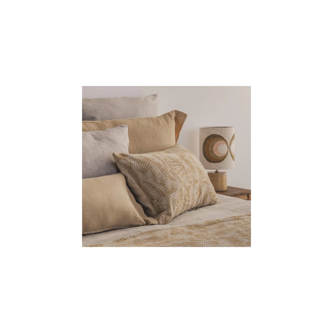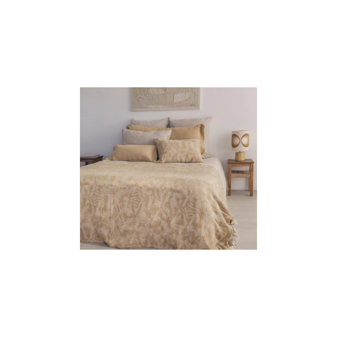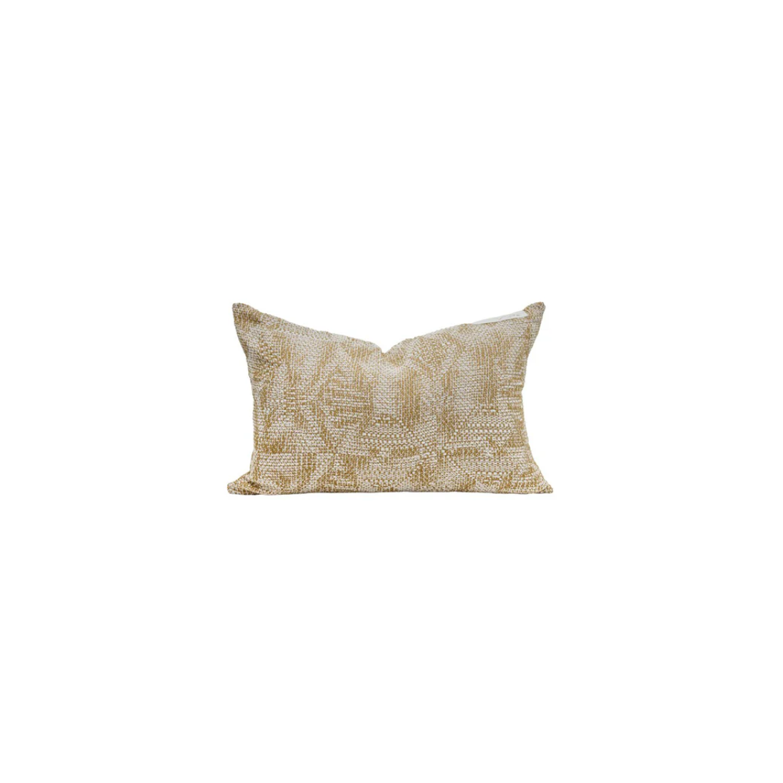 Coussin en jacquard de coton doux et très souple, à motif feuillage coloris écru et ocre clair.