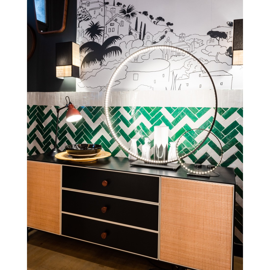 Icône du design français, la lampe à poser MEGA s'intégrera de manière élégante et design dans votre intérieur.Cette lampe à poser design, fabriquée en acier, est équipée d'un ruban LED intégré à l'intérieur du cercle.Elle diffuse une lumière directe et indirecte d'une puissance de 135W qui restitue 1584 lumens. La température de couleur est un blanc chaud.