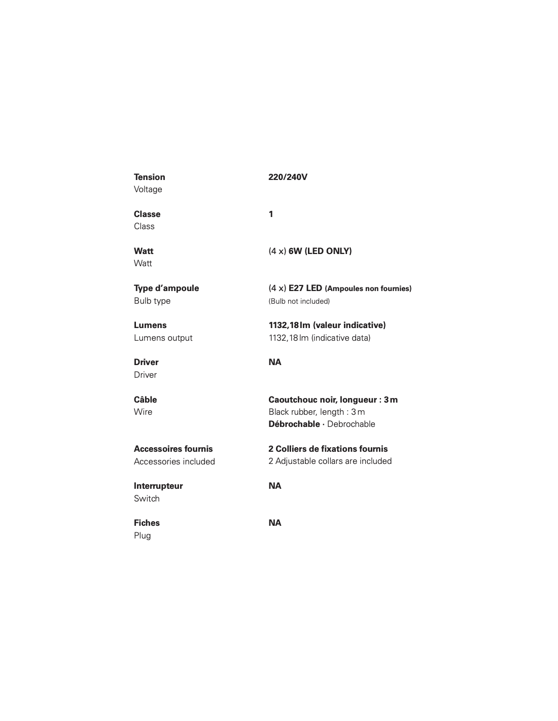 - Maille amovible: laiton/acier inoxydableRéflecteur: aluminium et acier inoxydableVisserie : acier inoxydableCâble : caoutchouc noir