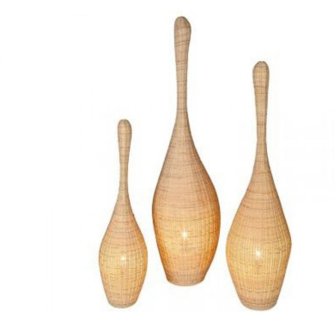 Cette famille de lampes entièrement réalisées en osier Tressé Naturel ou laqué Blanc mat, gris, noir, bleu océan, taupe, blueberry, date our ginger, présente une forme caractéristique qui rappelle celle d’une bouteille et un savant jeu de finitions, de formes et de couleurs.
