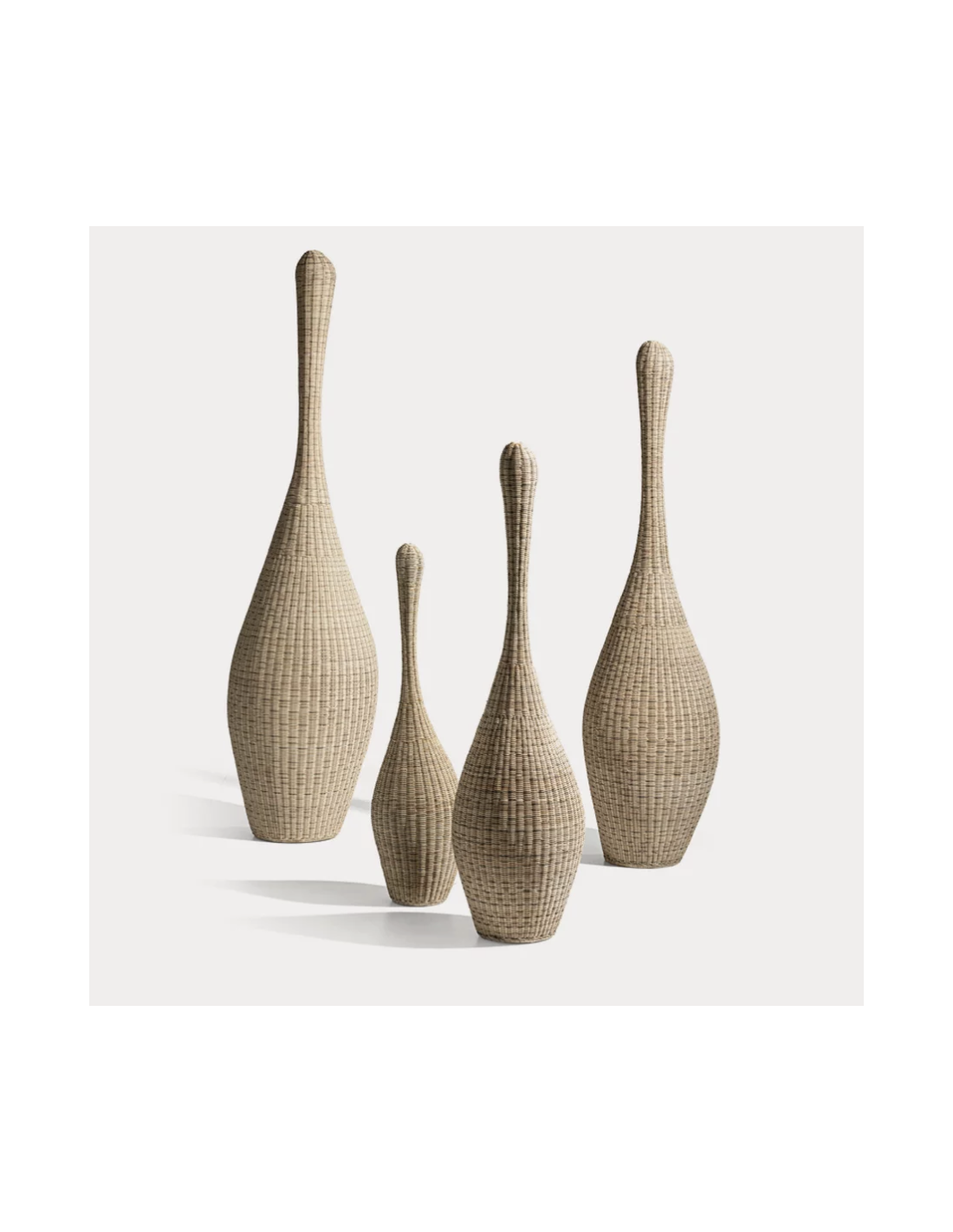 Cette famille de lampes entièrement réalisées en osier Tressé Naturel ou laqué Blanc mat, gris, noir, bleu océan, taupe, blueberry, date our ginger, présente une forme caractéristique qui rappelle celle d’une bouteille et un savant jeu de finitions, de formes et de couleurs.