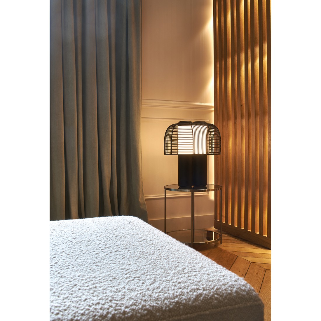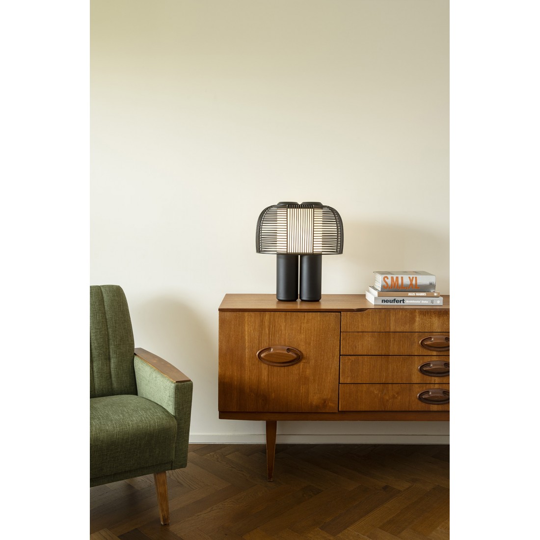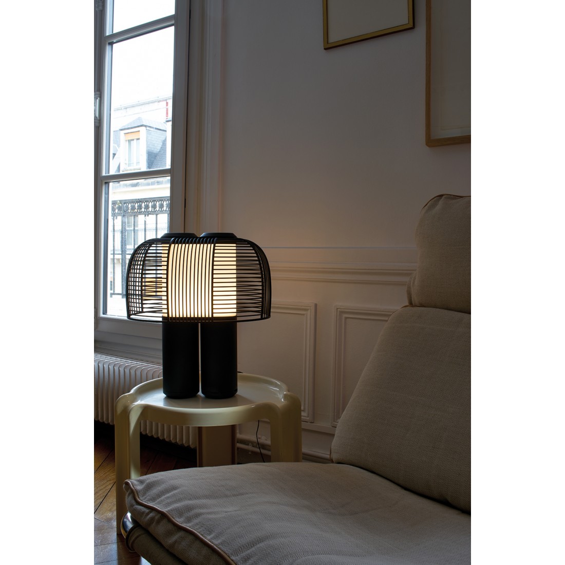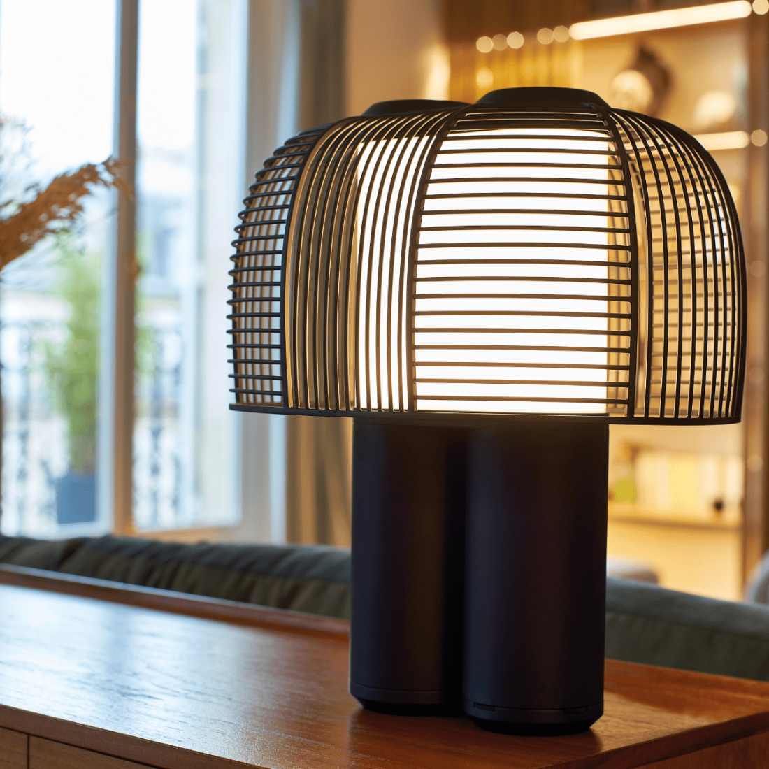 Lampe de table équipée de deux variateurs : l'un contrôle la température de couleur, l'autre contrôle l'intensité lumineuse.
