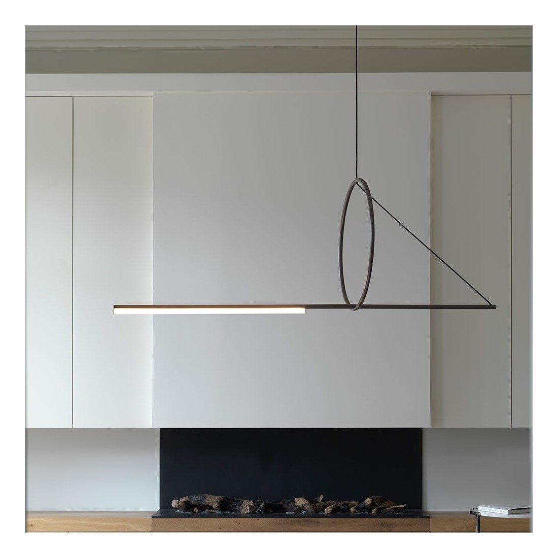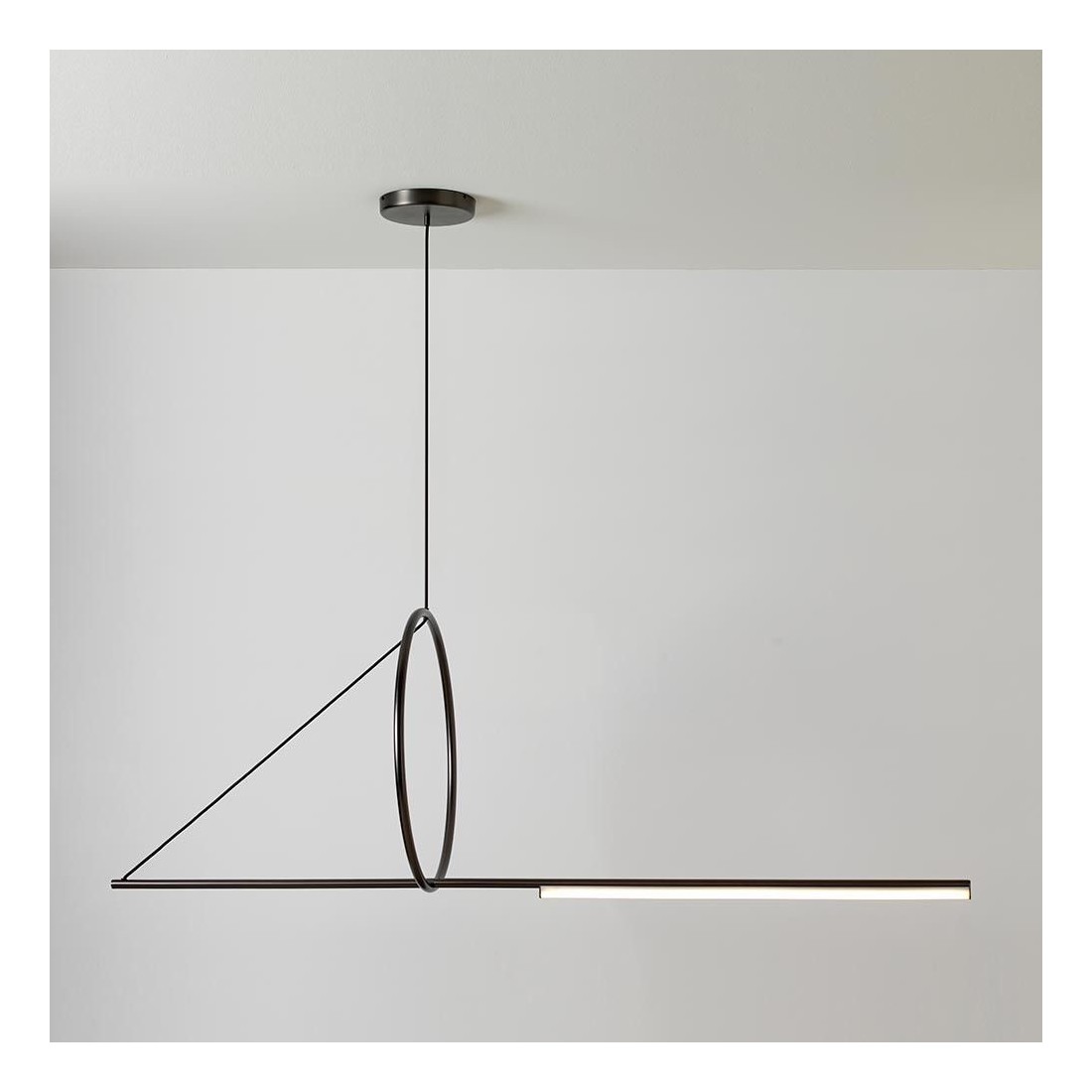 Cette suspension horizontale est réalisée en graphite satiné ou en laiton satiné (d'autres finitions sont possibles sur demande).