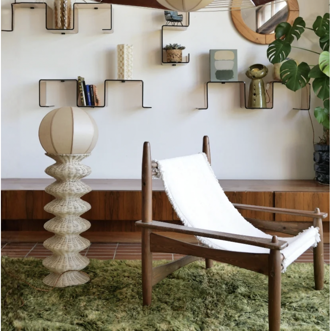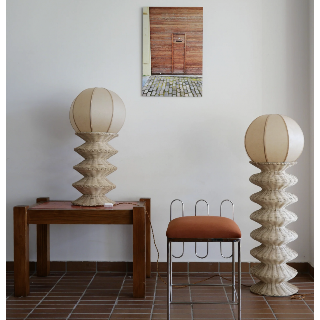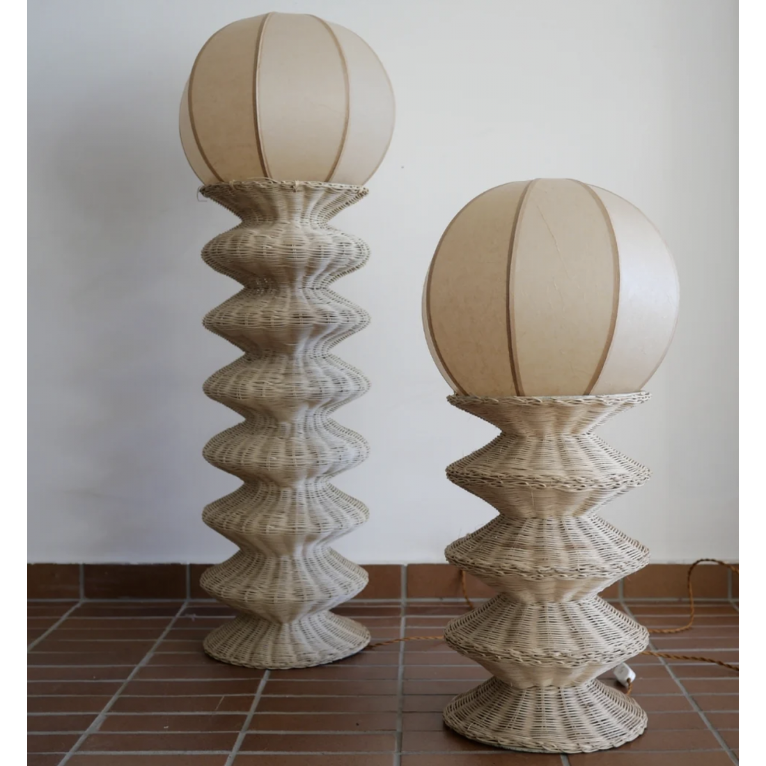 Sa structure en rotin naturel tressé à la main dessine une colonne rythmée et organique.