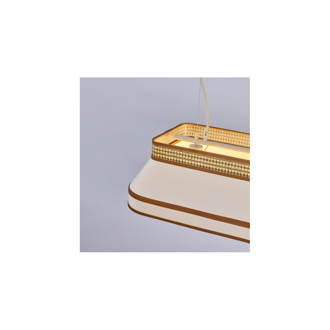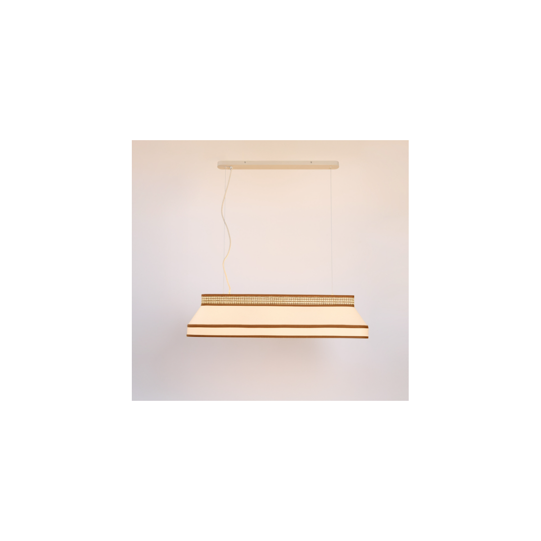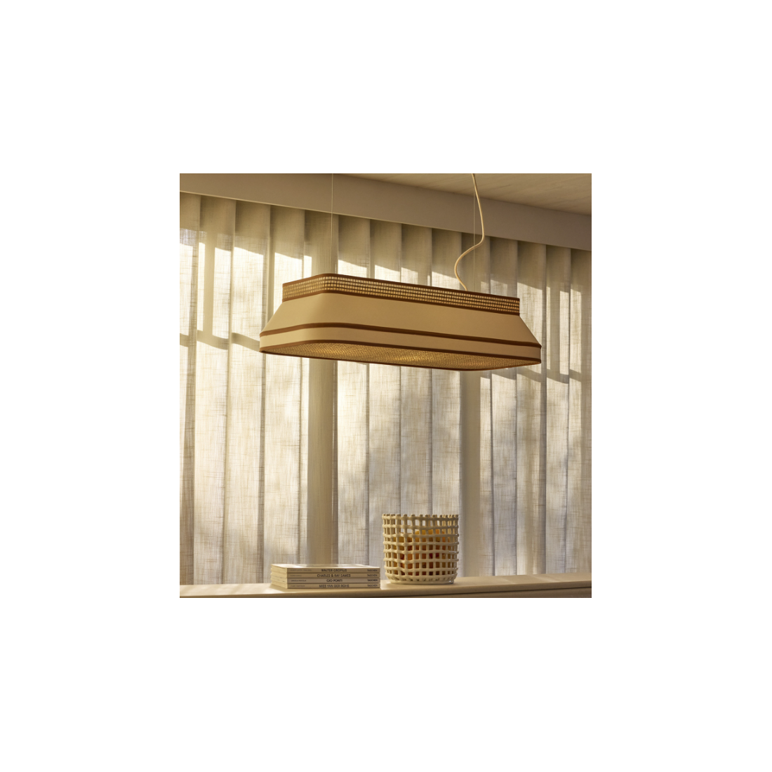 La suspension adopte une forme rectangulaire aux bords arrondis, composée de trois éléments en coton et papier tressé certifié FSC®.