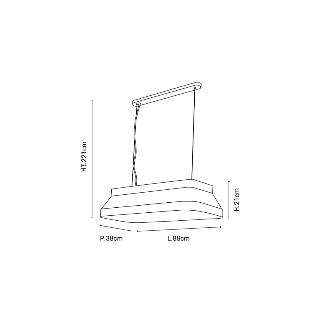 Elle mesure L88 × P38 × H21 cm avec une hauteur totale de 221 cm grâce aux cordons textiles réglables et à la réglette en métal. IP20, classe 2, elle fonctionne avec trois ampoules E27-15W (non fournies) et diffuse la lumière à 360° pour un éclairage homogène.