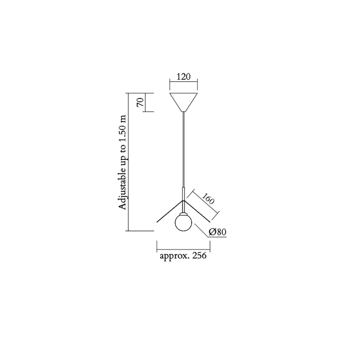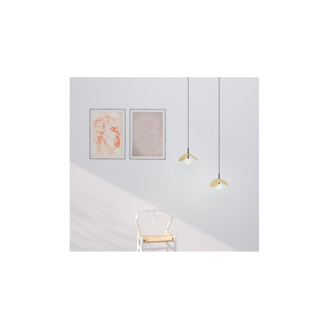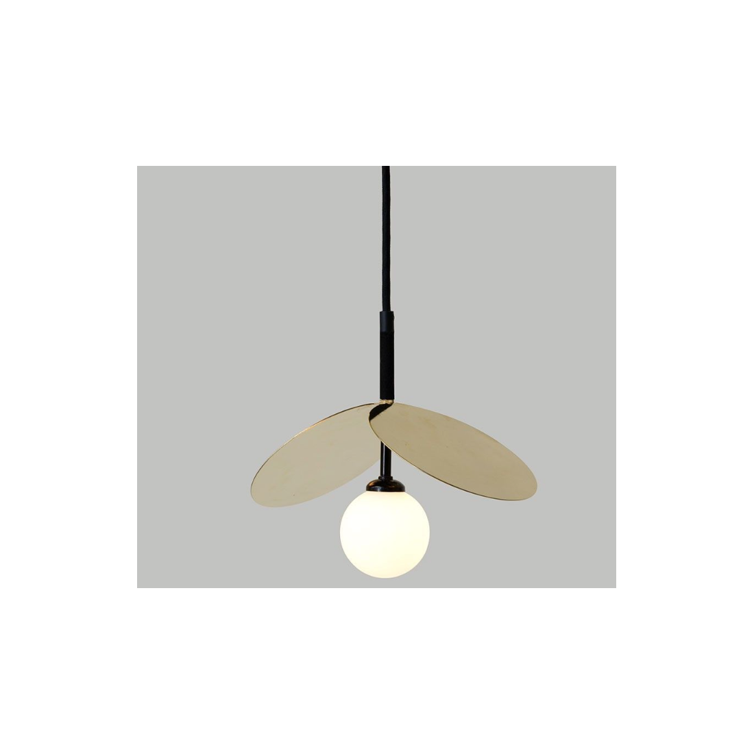 La suspension Ilios est réalisée en laiton massif, métal laqué époxy et verre opale. Le disque en laiton reflète la lumière du globe ("Ilios" vient du mot grec qui signifie "soleil"). La suspension est disponible avec un cable en tissu noir (un bras en métal noir est disponible sur demande).