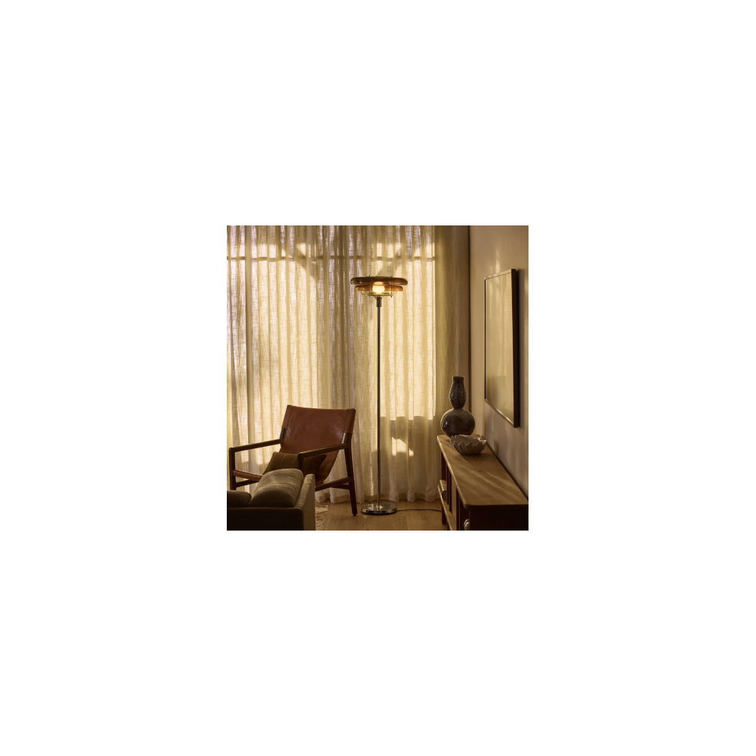 La lampe sur pied Sunset de MARKET SET allie des matériaux haut de gamme tels que le verre et le métal à un design unique couleur ambre.