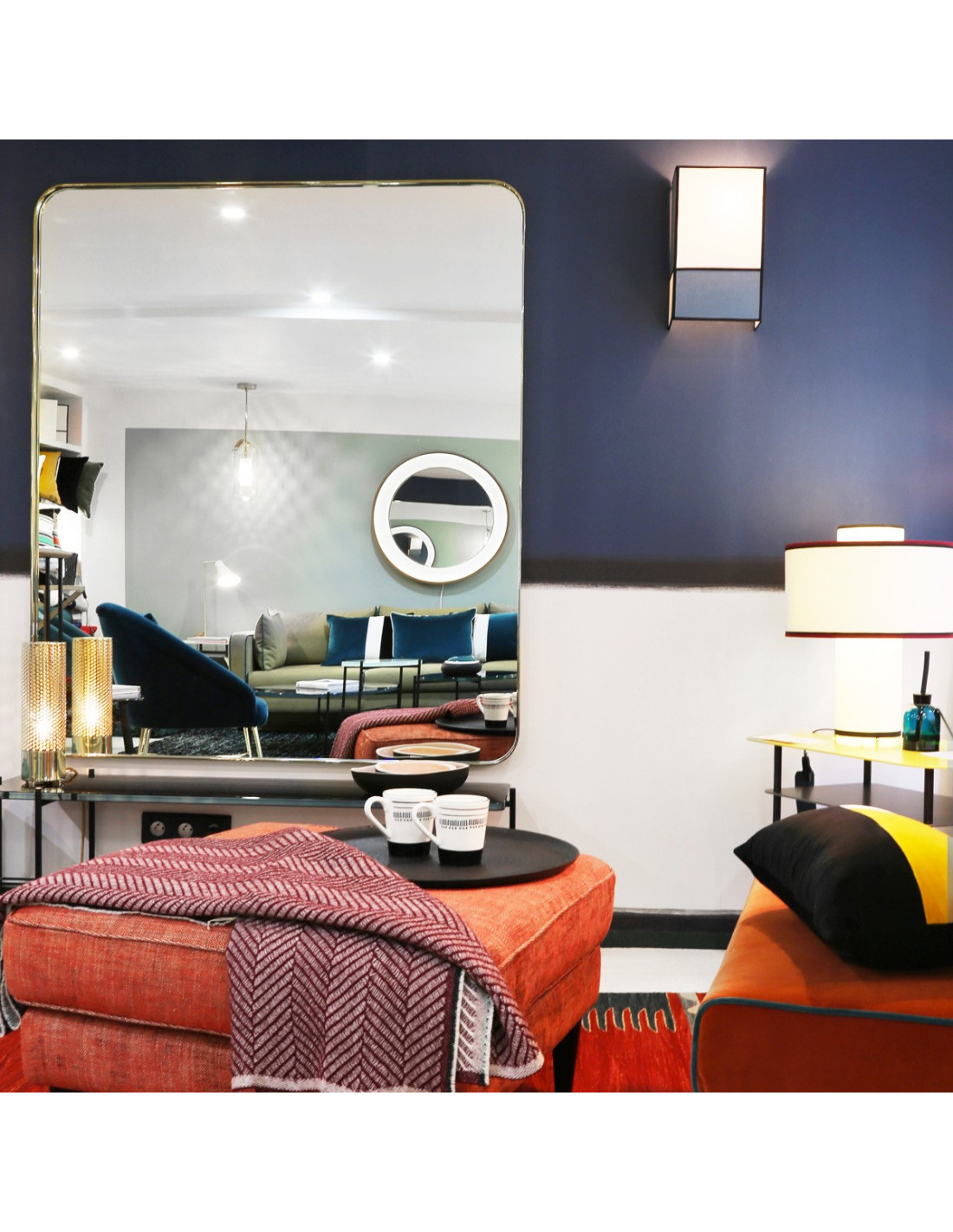 Ce miroir de grande envergure agrandit et illumine l'espace. Son design, inspiré des années 50, est souligné par un encadrement unique : le retour de laiton apposé sur le miroir semble l'envelopper de lumière.