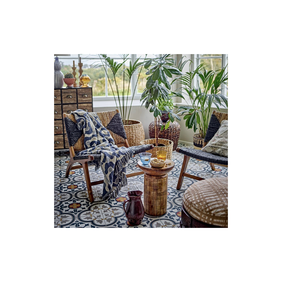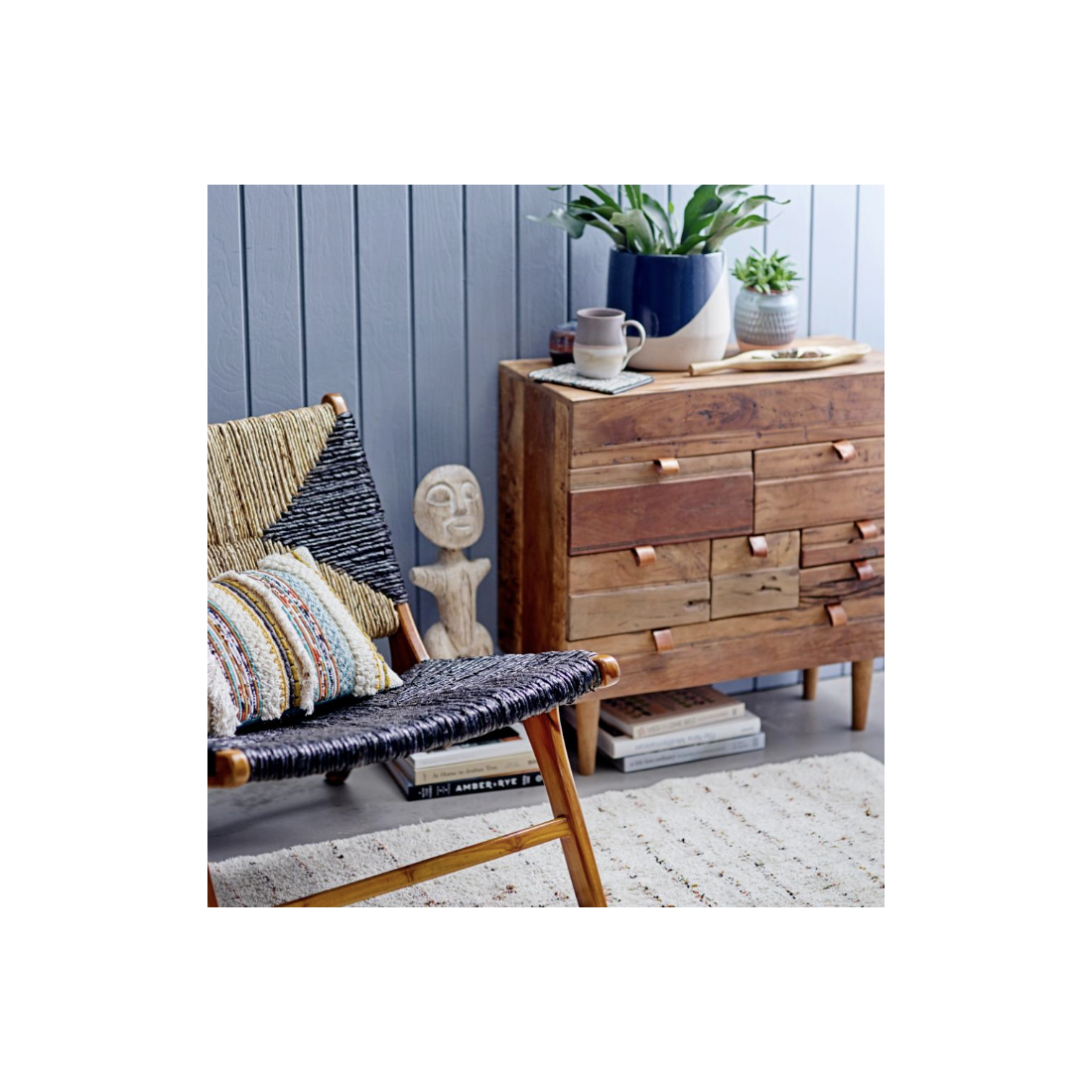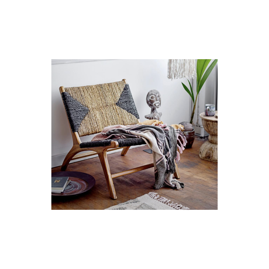 La Chaise de salon Grant de la Creative Collection est en bois de teck solide. Il a un motif graphique noir et nature sympa. Les cordes souples sont fabriquées à partir de feuilles de bananier et offrent un grand confort d’assise.