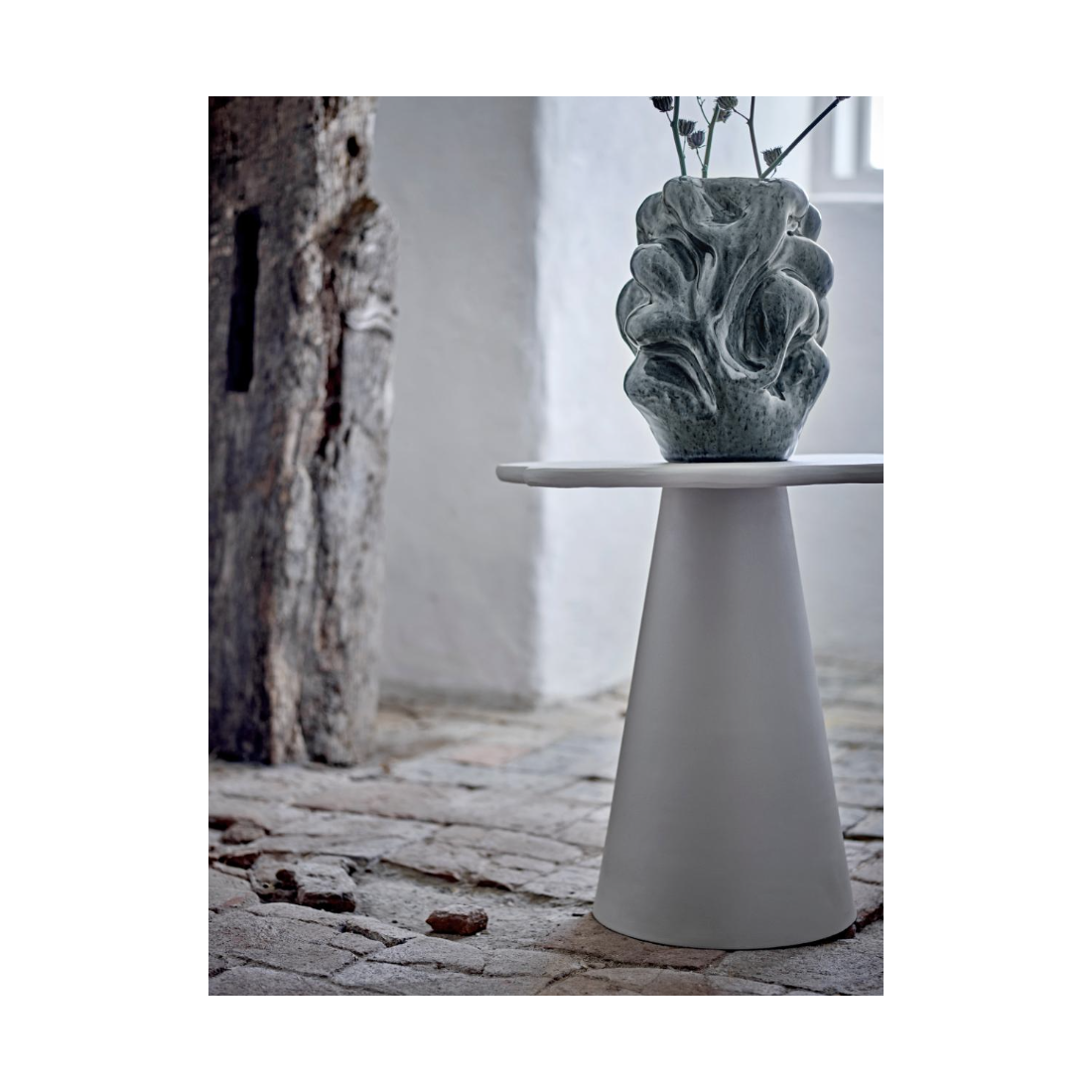 La Table d'Appoint Ray de Bloomingville est faite de béton gris. Appréciez le beau contraste entre le béton rustique et la forme arrondie.