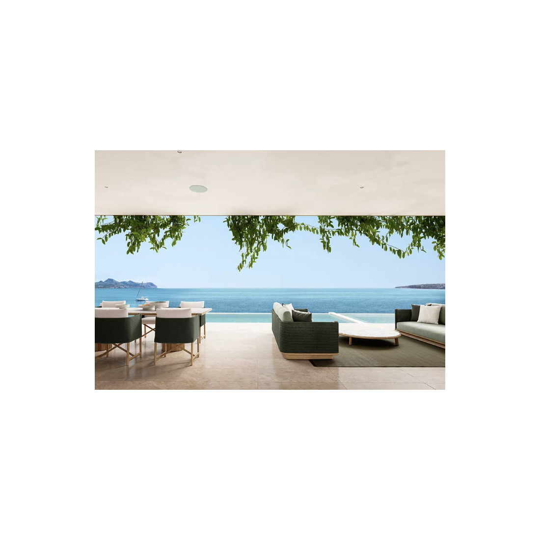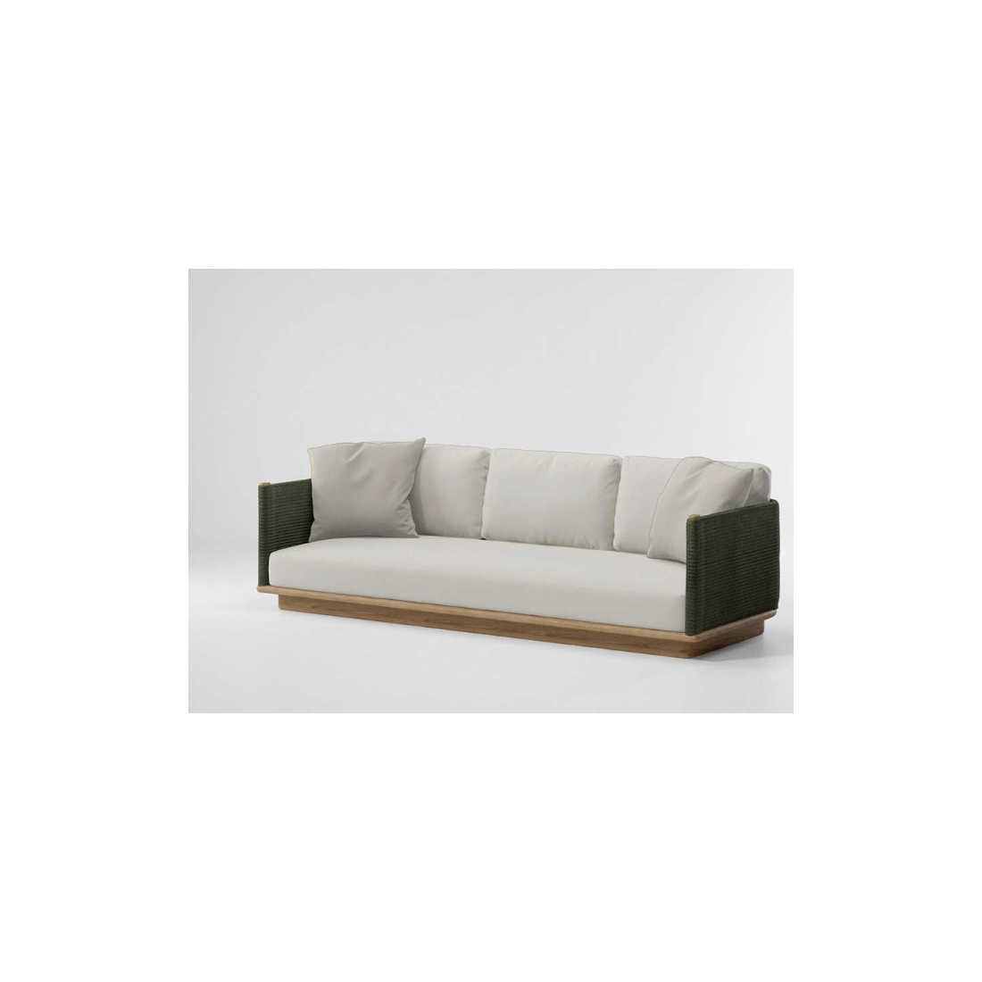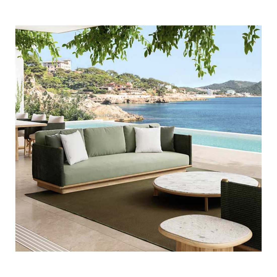 Utilisable en intérieur et en extérieur, le canapé haut de gamme se caractérise par un piètement en bois de teck et une coque tressée en corde de polyester et de polypropylène.