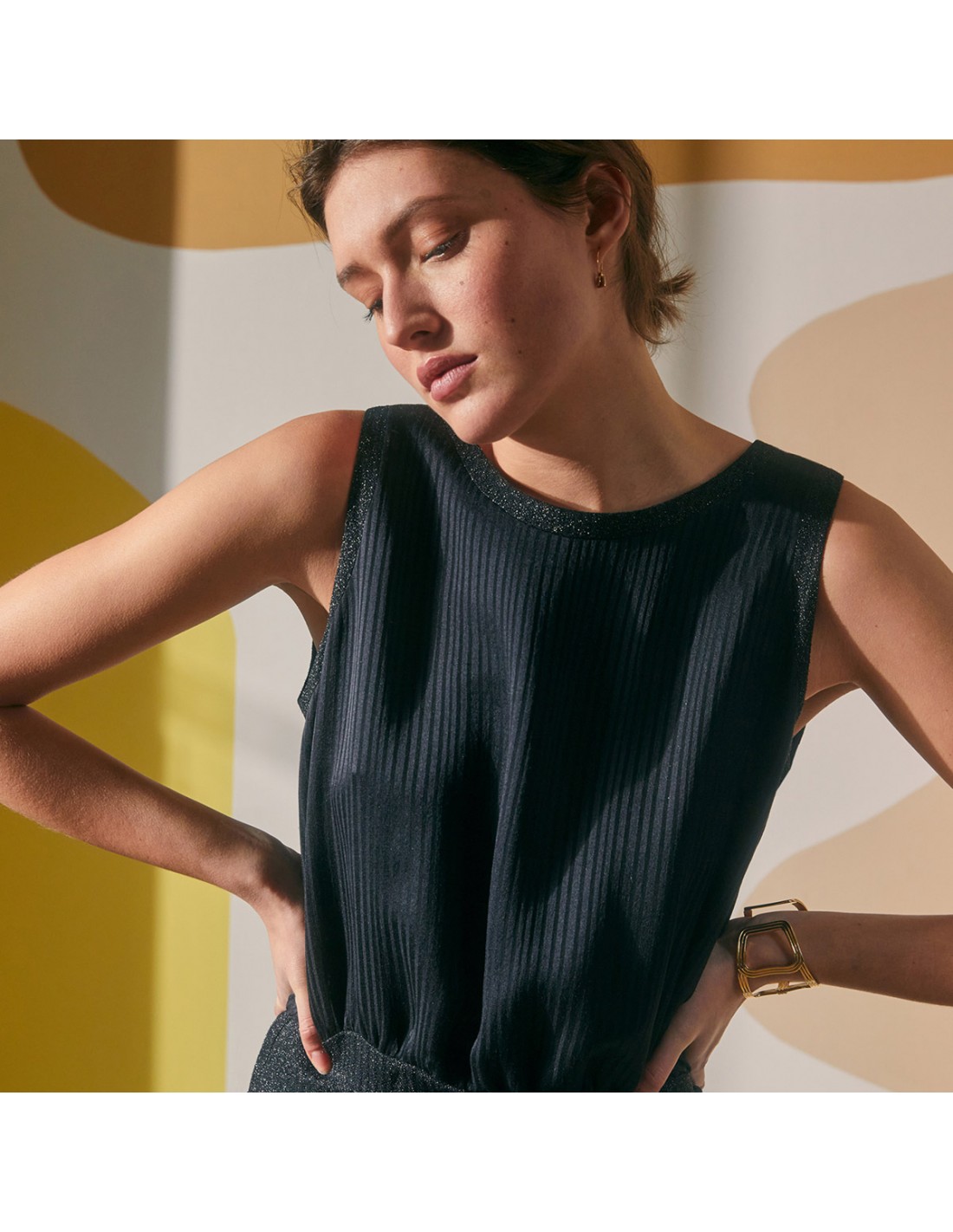 Son haut est blousant et la jupe est près du corps grâce à ses découpes qui dessinent une belle silhouette.