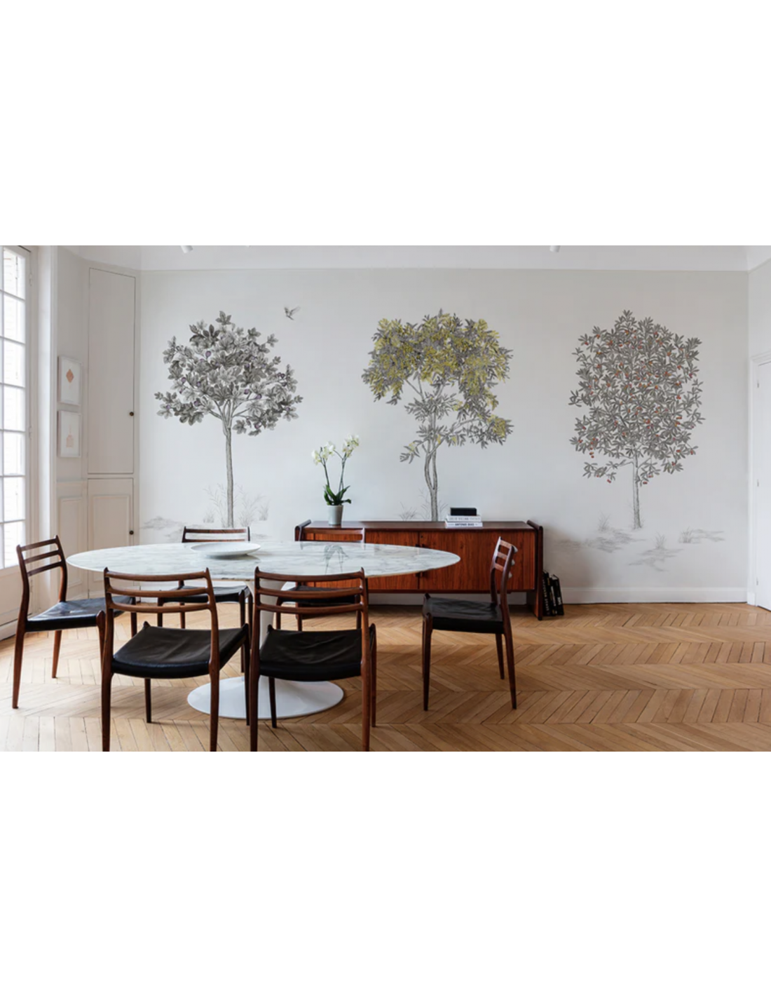 Ces trois arbustes aux délicates couleurs et traits fins sont dessinés au fusain par Francesco Battista ; un modèle qui invite à contempler la nature.