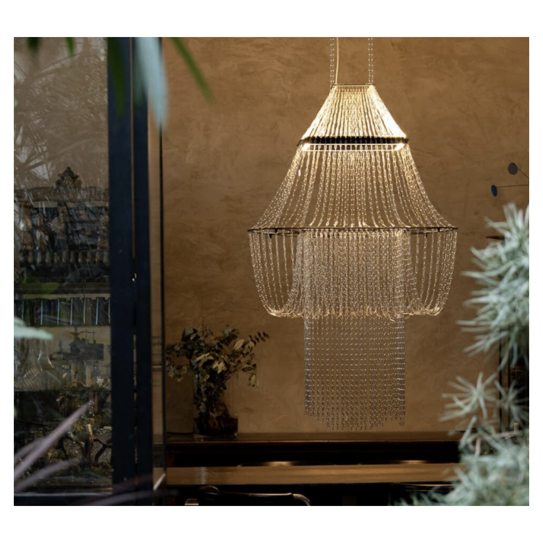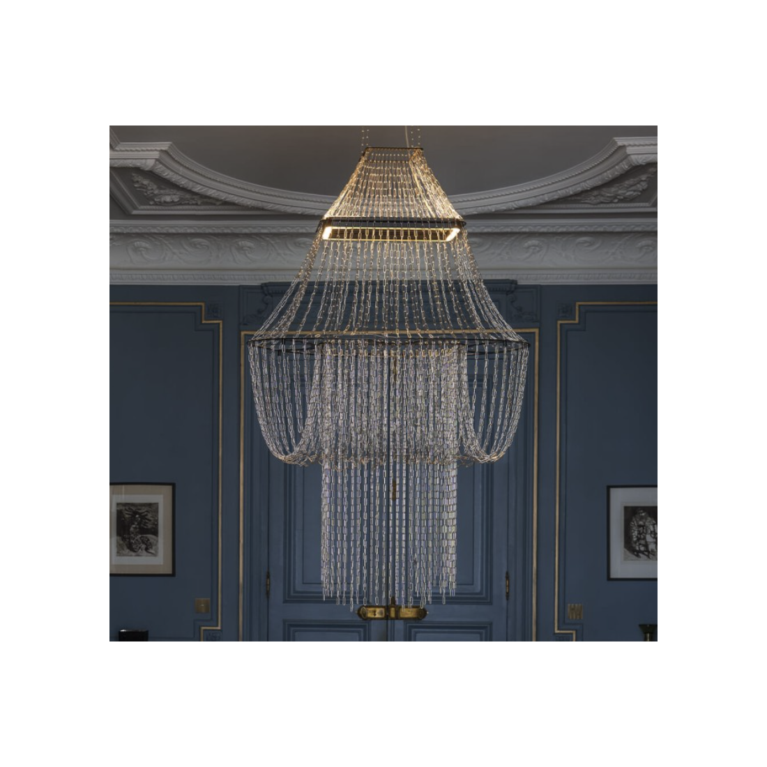 Conservant la forme et le galbe d’un modèle classique, ce chandelier en chaines, hors norme, perpétue la magie de la lumière. Sans verre, ni cristal, la lumière vient se poser pour faire scintiller des gouttelettes de lumière sur les 6400 maillons d’inox.
