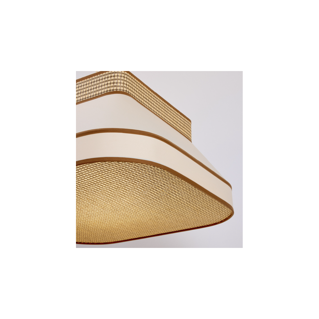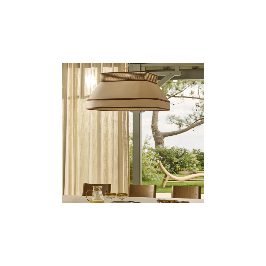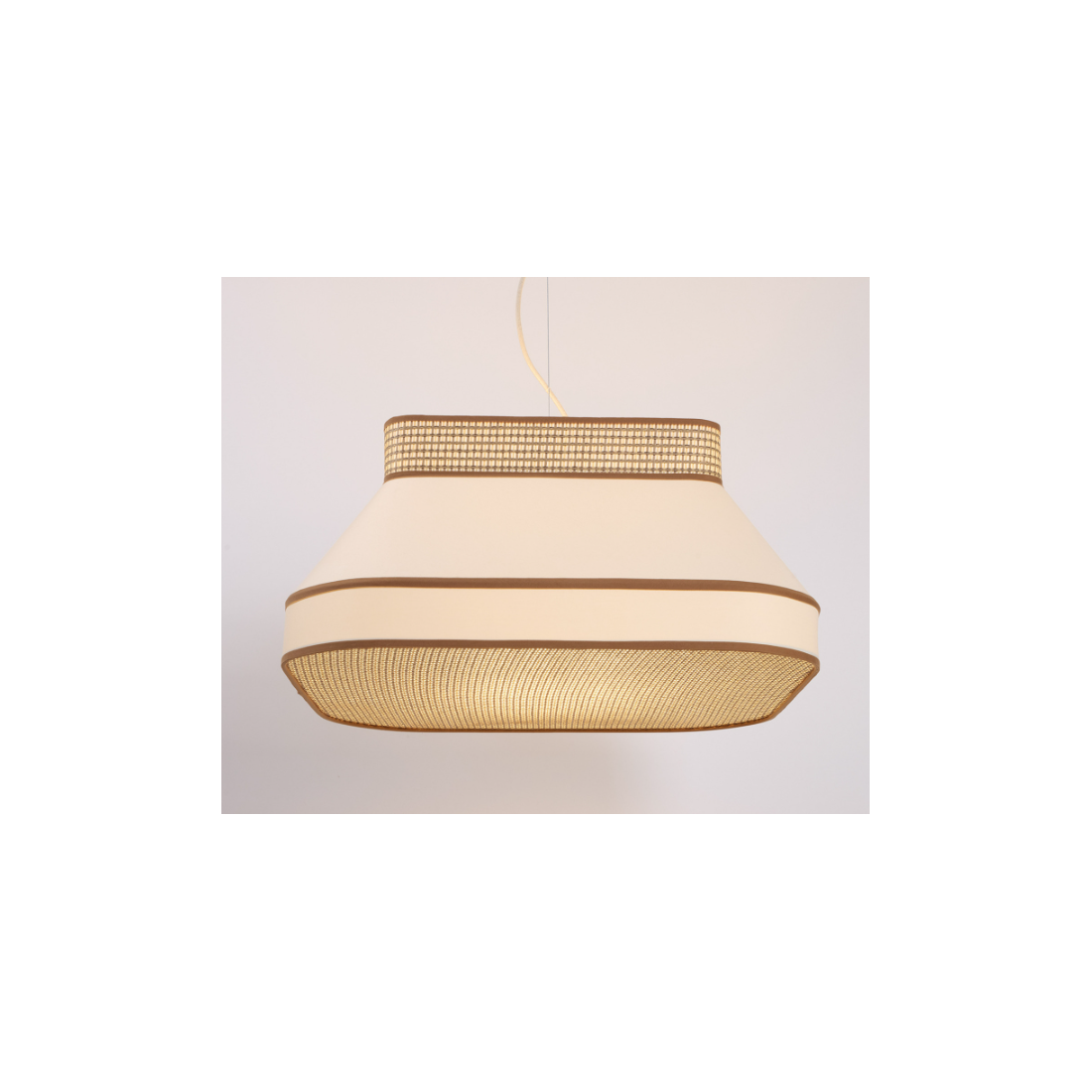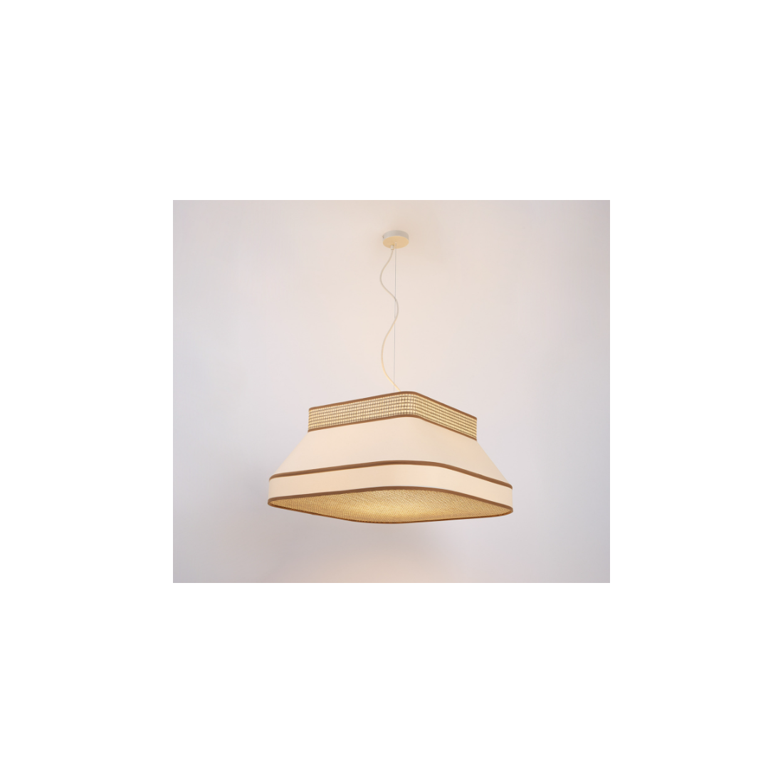 La suspension adopte une forme carrée aux bords arrondis, composée de trois éléments en coton et papier tressé certifié FSC®.