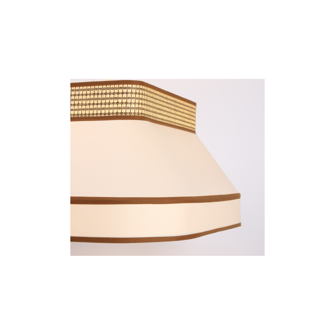 Elle se positionne idéalement au-dessus d’une table, d’un bureau ou dans un salon lumineux, en jouant avec la lumière diffusée à travers son abat-jour en trame naturelle.