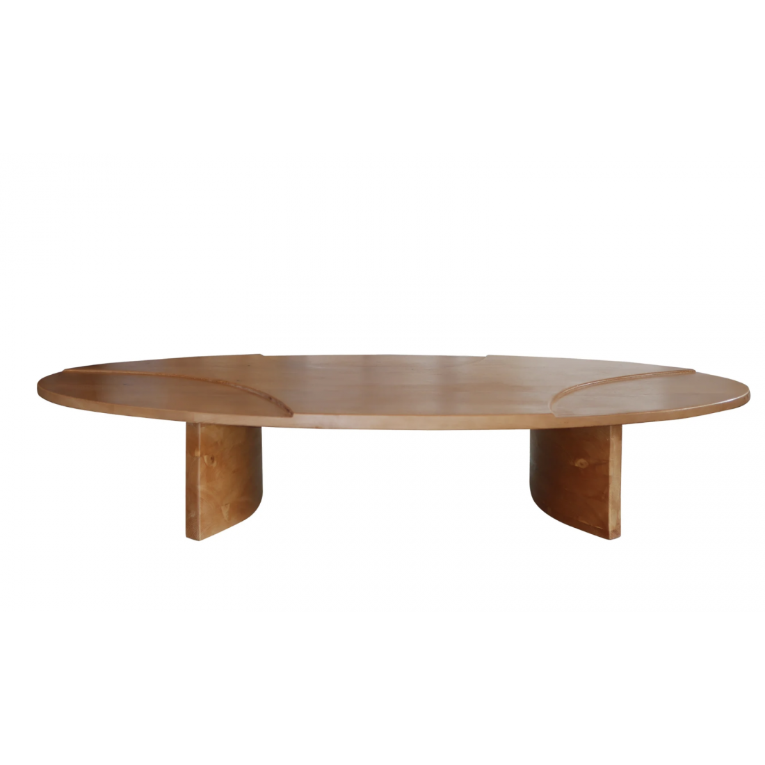 La table basse est en bois couleur miel sculpté à la main, les pieds sont arrondis.